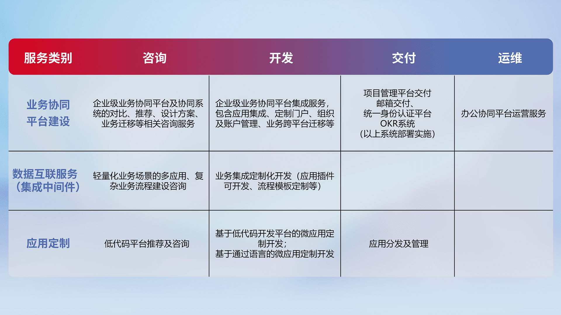 针对钉钉、、企微、、、IDaas等平台级产品提供产品的规划、、、、方案、、交付、、、定制化开发等服务,,实现如统一协同办公、、、智能客户服务、、混合会议管理、、、智能数据查询、、等业务场景,,实现数字化转型。。